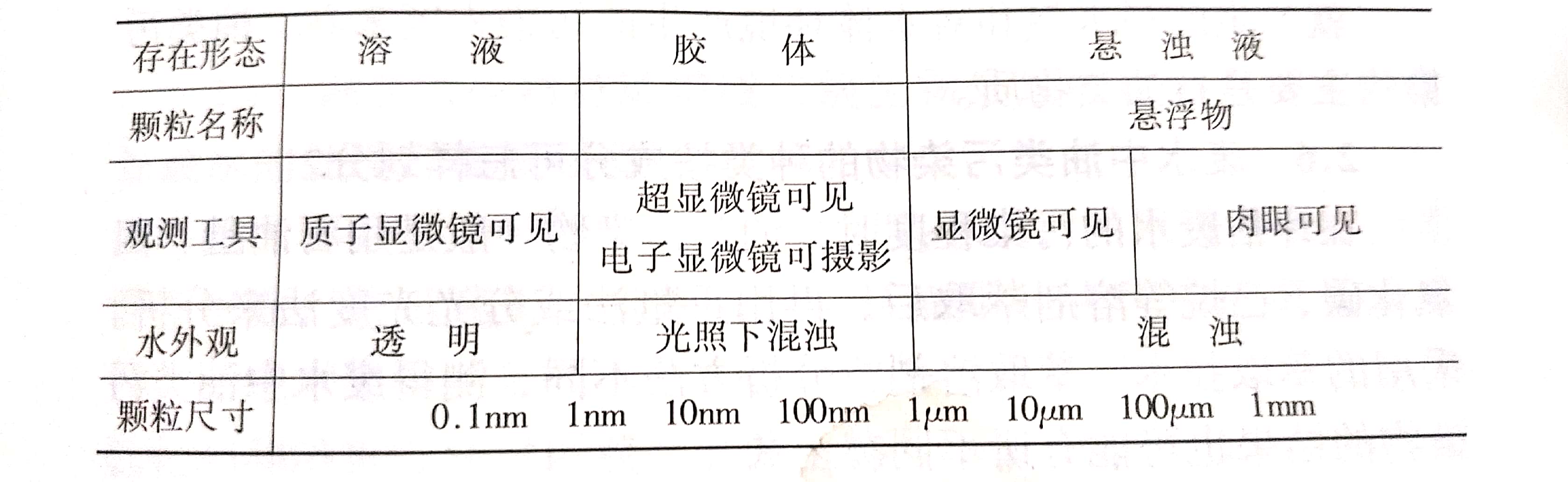 廢水中雜質(zhì)顆粒按存在形態(tài)可以分為懸浮物質(zhì)、膠體物質(zhì)和溶解性物質(zhì)等三種,其具體分散狀態(tài)和尺寸見下圖: